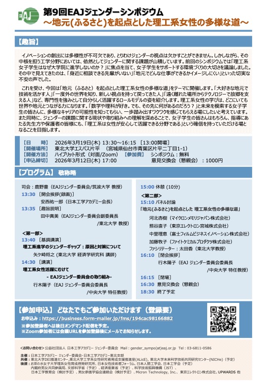 【ご案内】第9回 EAJジェンダーシンポジウム 「地元(ふるさと)を起点とした理工系女性の多様な道」(3/19開催)