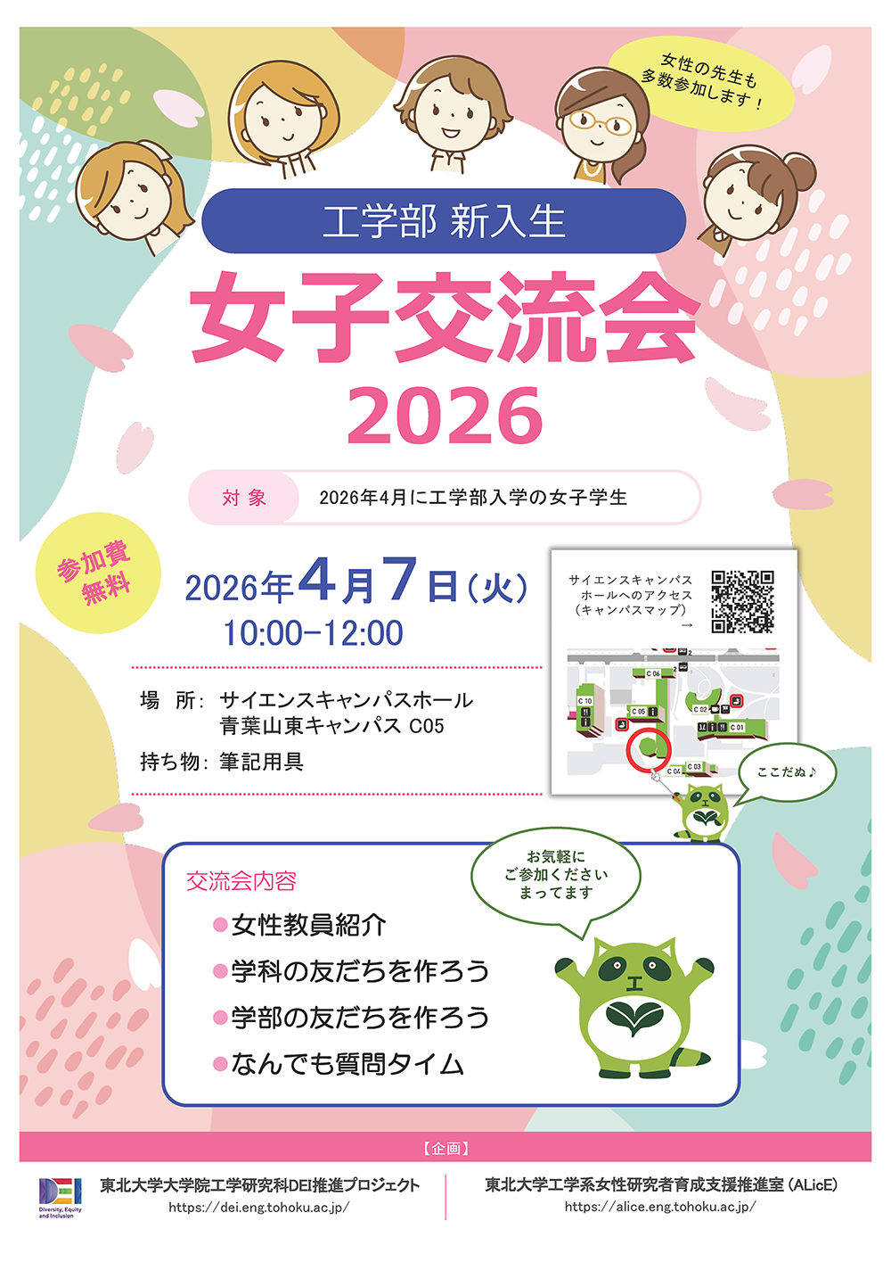 東北大学工学部の女子新入生のみなさんを対象に、交流会を開催いたします。